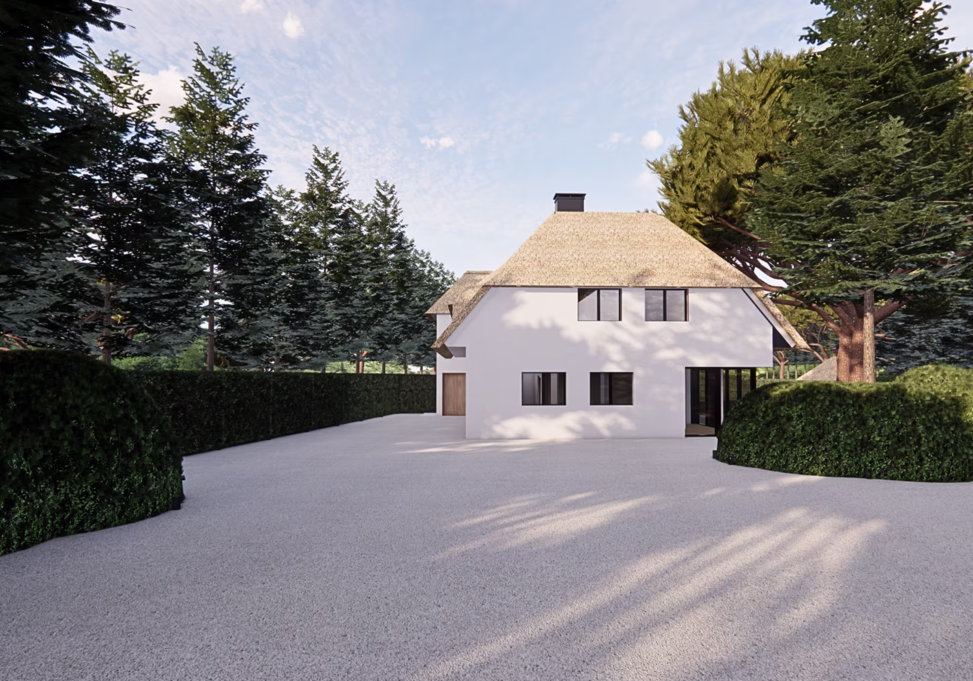 Voor deze villa in Bergen ontwierp ik een moderne tuin met een royale grindoprit en een carport die aansluit op de stijl van het huis. Het rieten dak in combinatie met subtiele spotlights geeft de entree een luxe en eigentijdse uitstraling.
