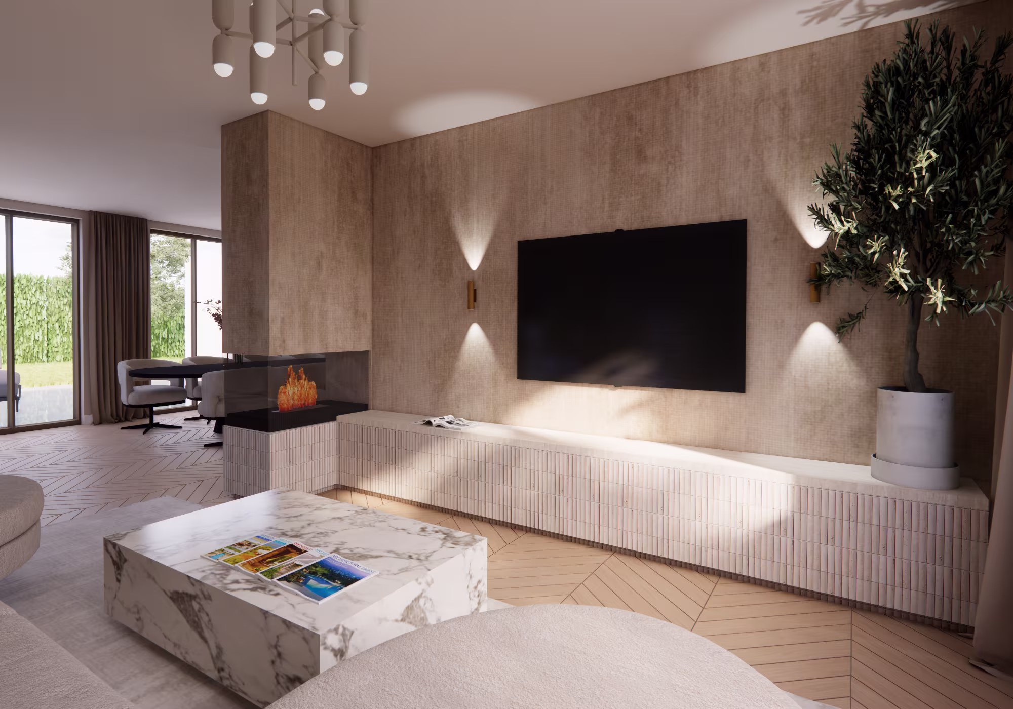 Een warm en verfijnd interieur waarin zachte tinten en rijke materialen een rustig en elegant geheel vormen.