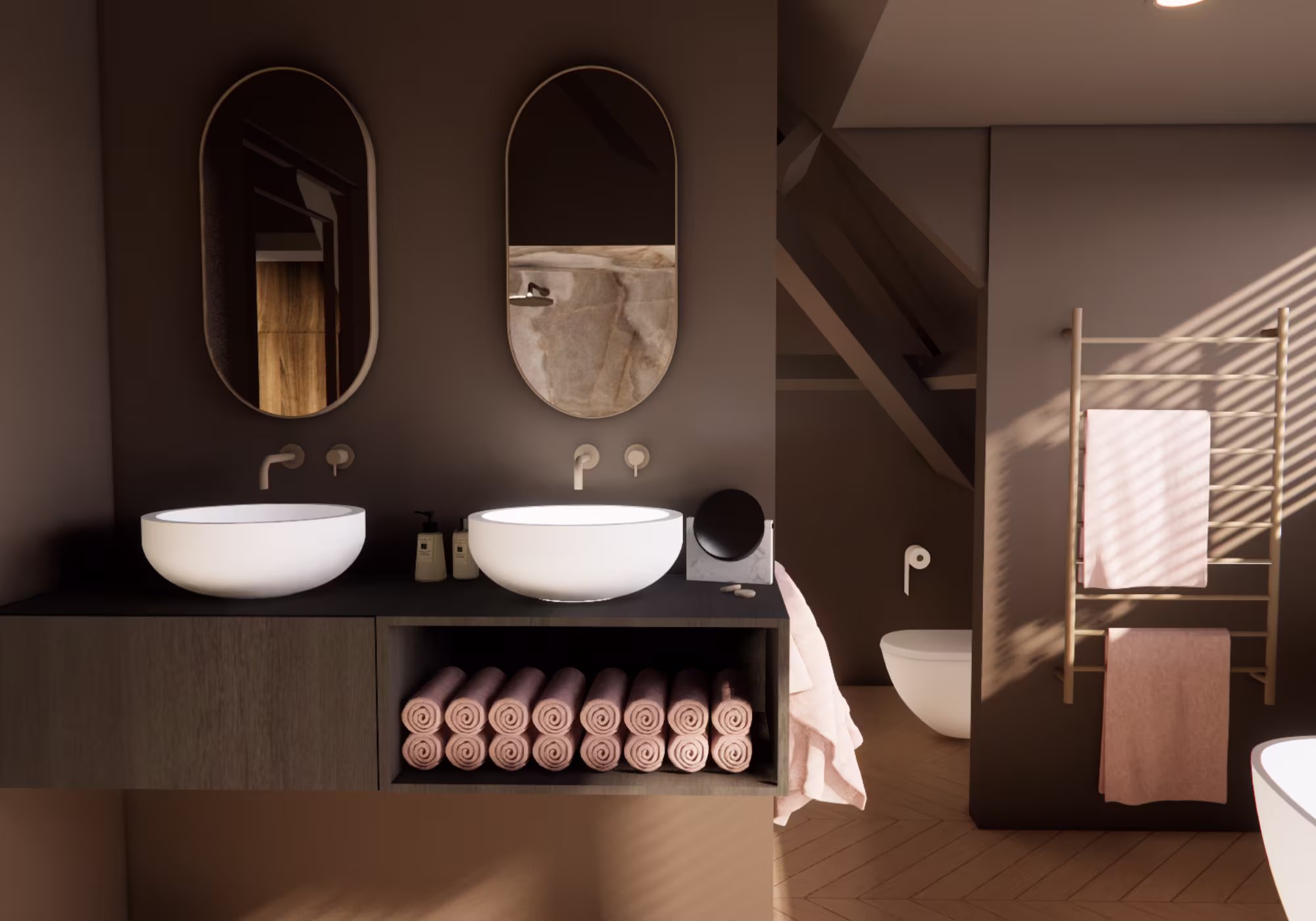 Voor deze zolder in Naarden ontwierp ik een stijlvolle slaapkamer met een ensuite badkamer. Donkere accenten, rijke materialen en verfijnde details geven de ruimte een exclusieve en luxe uitstraling.