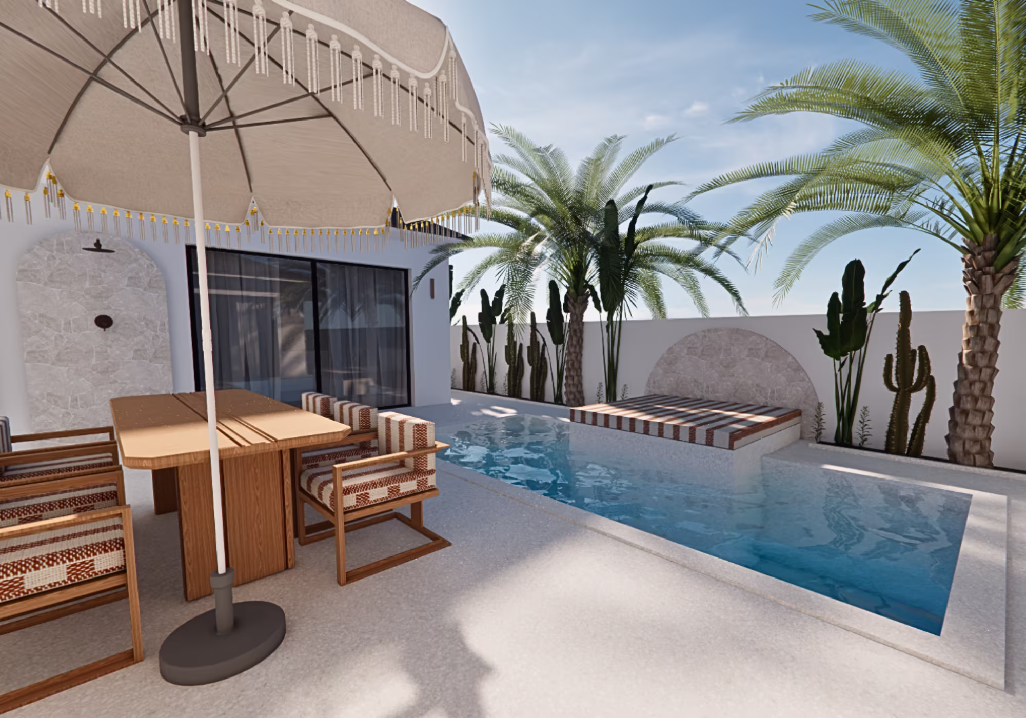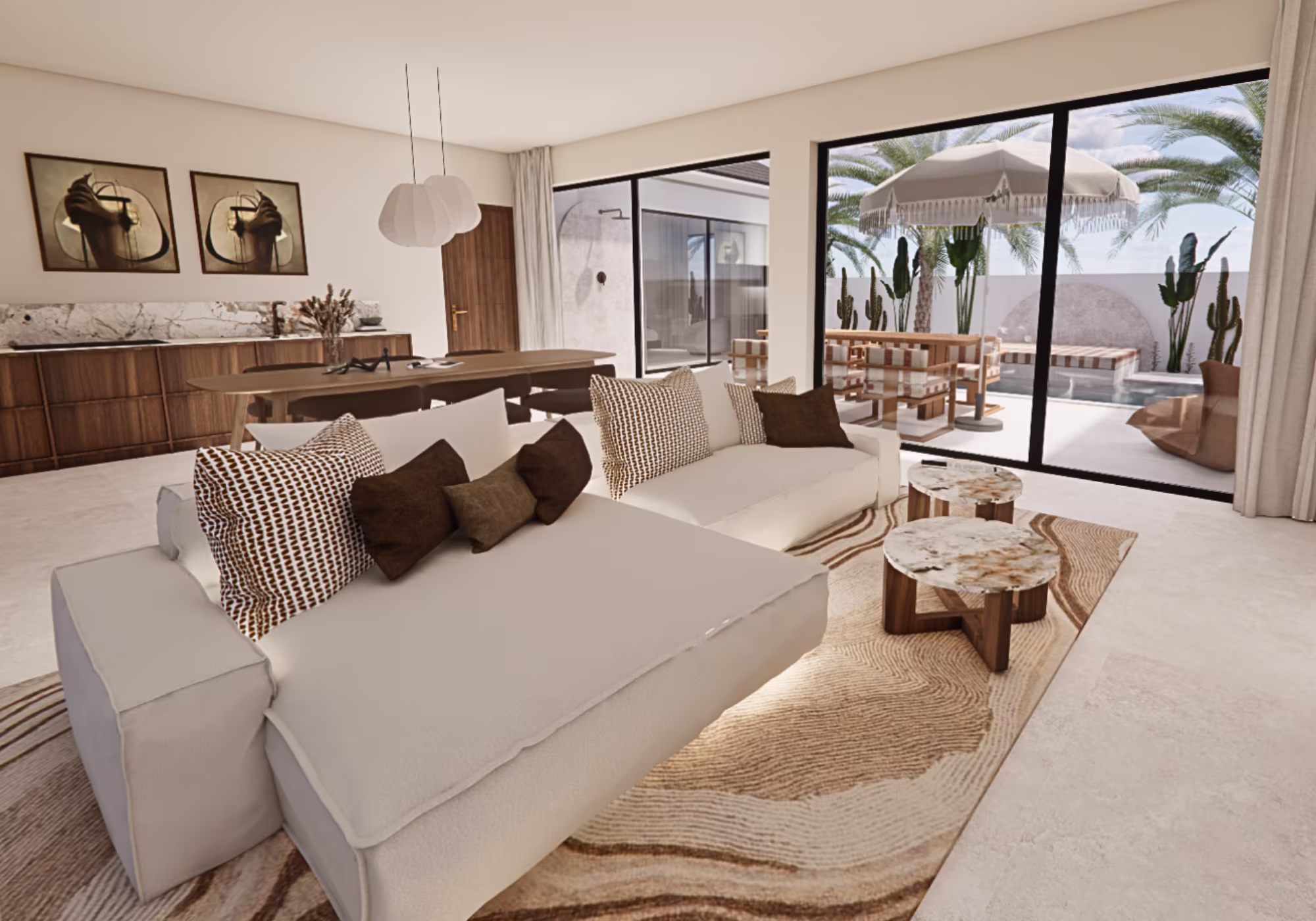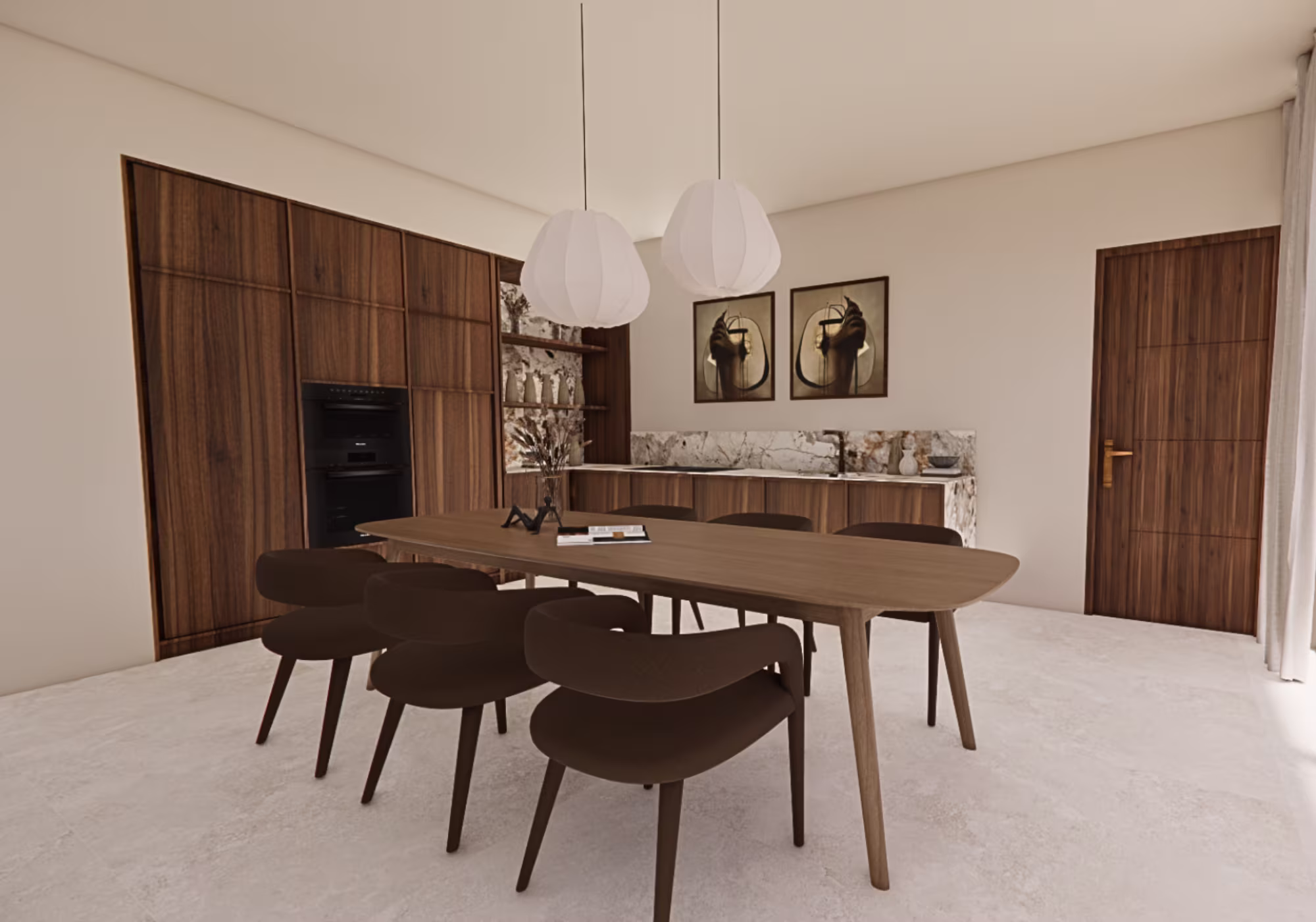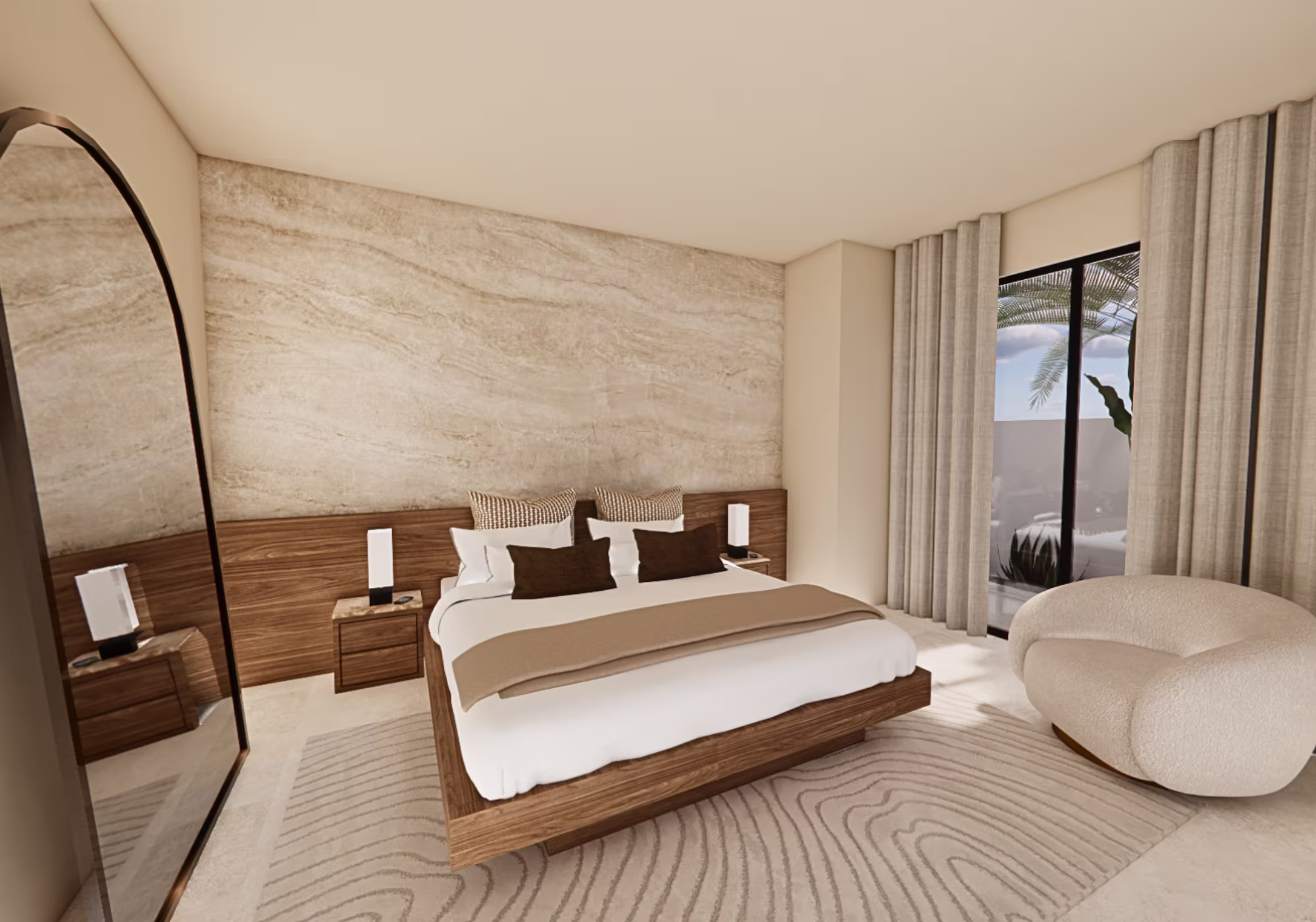 Voor deze villa creëerde ik een warm en tropisch interieur met diepe bruine tinten, terracotta accenten en natuurlijke materialen. Travertin steen en zachte kleuren brengen rust en geven de woning een serene, luxe uitstraling.